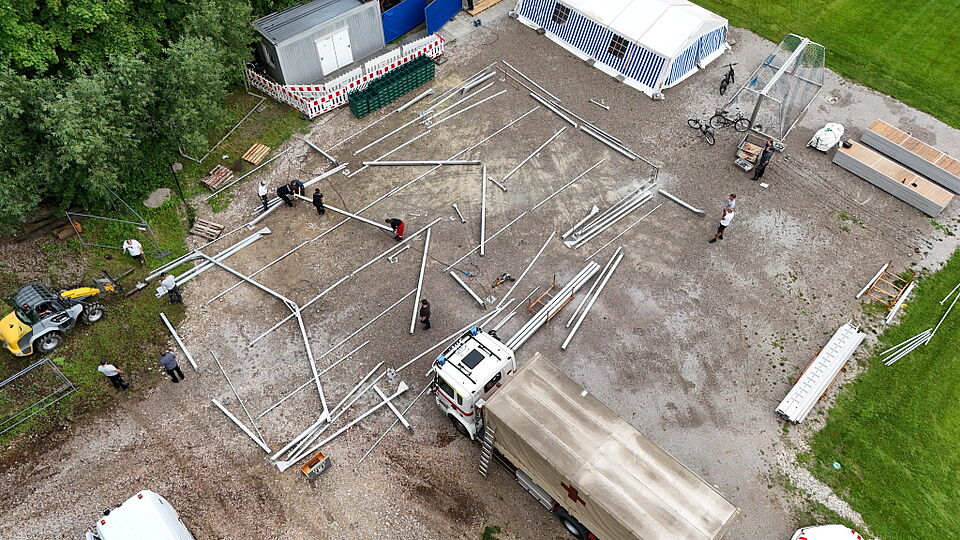 Mit dem Großzelt konnte ein Festakt des Unternehmens auch bei den momentanen Wetterbedingungen abgehalten werden. Beim Auf- und Abbau wurden die Helfer des Fachdienstes tatkräftig von den örtlichen Mitarbeitern unterstützt.